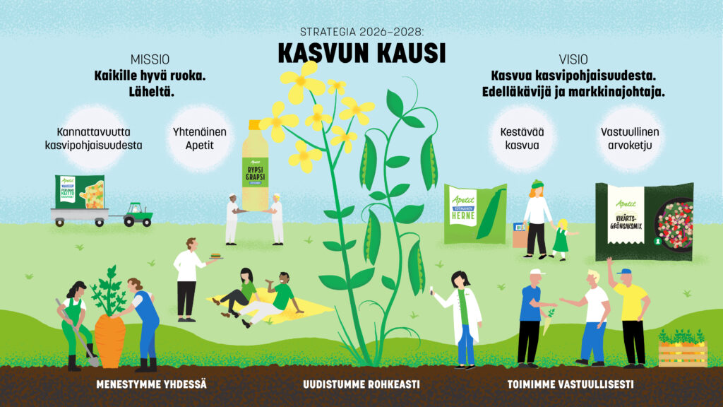 Apetit Oyj:n strategian pääteema vuosille 2026–2028 on Kasvun kausi. Kasvua haetaan erityisesti pakasteherneestä, Ruotsin markkinoilta sekä BlackGrain from Yellow Fields® -rapsijauheesta.
