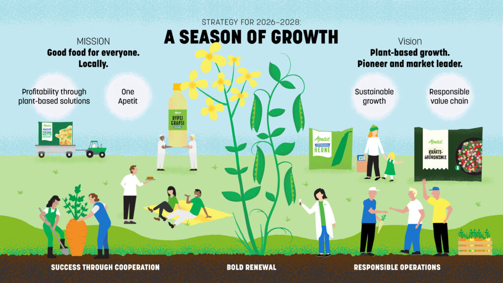 The main theme of Apetit Plc’s strategy for 2026–2028 is A Season of Growth. Growth will be pursued particularly from frozen peas, the Swedish market, and BlackGrain from Yellow Fields® rapeseed powder.