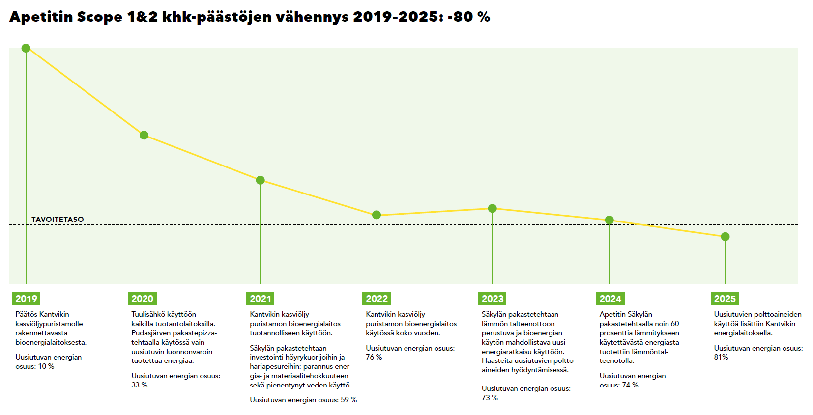 Apetitin oman toiminnan kasvihuonekaasupäästöt aiheutuvat pääasiassa tuotantolaitosten käyttämästä energiasta. Apetit on vähentänyt oman toimintansa päästöjä systemaattisesti investoimalla uusiutuvan energian käyttöön. Vuonna 2025 Apetitin omasta toiminnasta (Scope 1&2) aiheutuvat kasvihuonekaasupäästöt olivat yhteensä 4 516 tonnia ja ovat vähentyneet 80 prosenttia vuoteen 2019 verrattuna.