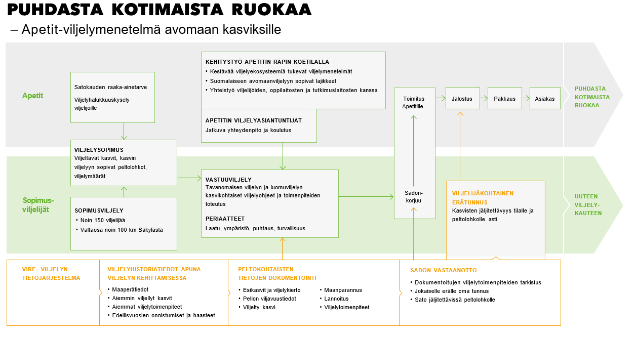Apetit on vahvasti integroitunut kotimaiseen alkutuotantoon. Apetitin noin 150 sopimusviljelijää viljelee vuosittain miljoonia kiloja kotimaisia kasviksia Apetitin Säkylän pakastetehtaalle. Apetit on Suomen suurin avomaankasvisten viljelyttäjä.